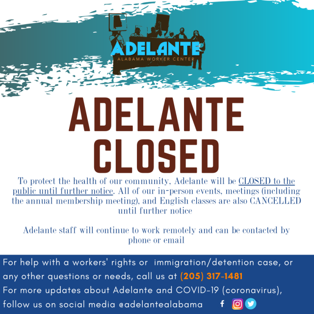 Due to COVID-19 (coronavirus), we have decided to CLOSE our office to the public until April 30, 2020. It’s critical that we ensure the health of our members and of the community in this moment of uncertainty. Also, we are POSTPONING these events until further notice: Annual Membership Meeting, English classes, Women’s Groups, ALL committee meetings and other events normally held at Adelante. Adelante staff will continue working from home and can be contacted by phone. For help with workers’ rights or immigration detention cases, or for other needs or questions, call us at (205) 317-1481 or email us at info@adelantealabama.org. To stay up-to-date on our office closure and COVID-19, follow us on Twitter and Instagram @adelantealabama or on Facebook at Adelante Alabama Worker Center